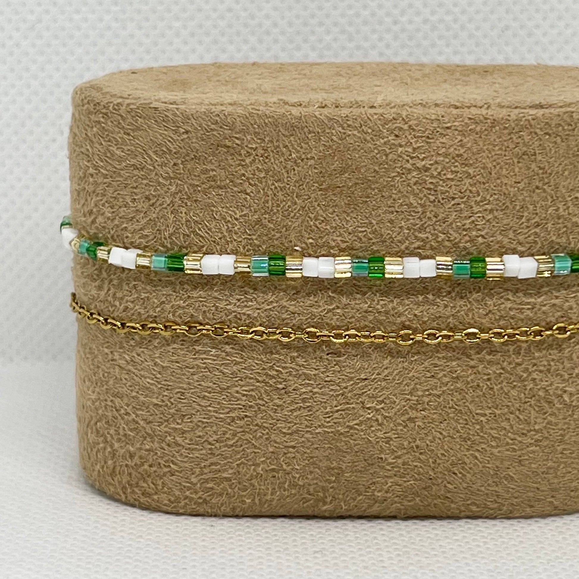 Bracelet 2 en 1 - Double chaîne dorée & perles de verre disponible en plusieurs couleurs