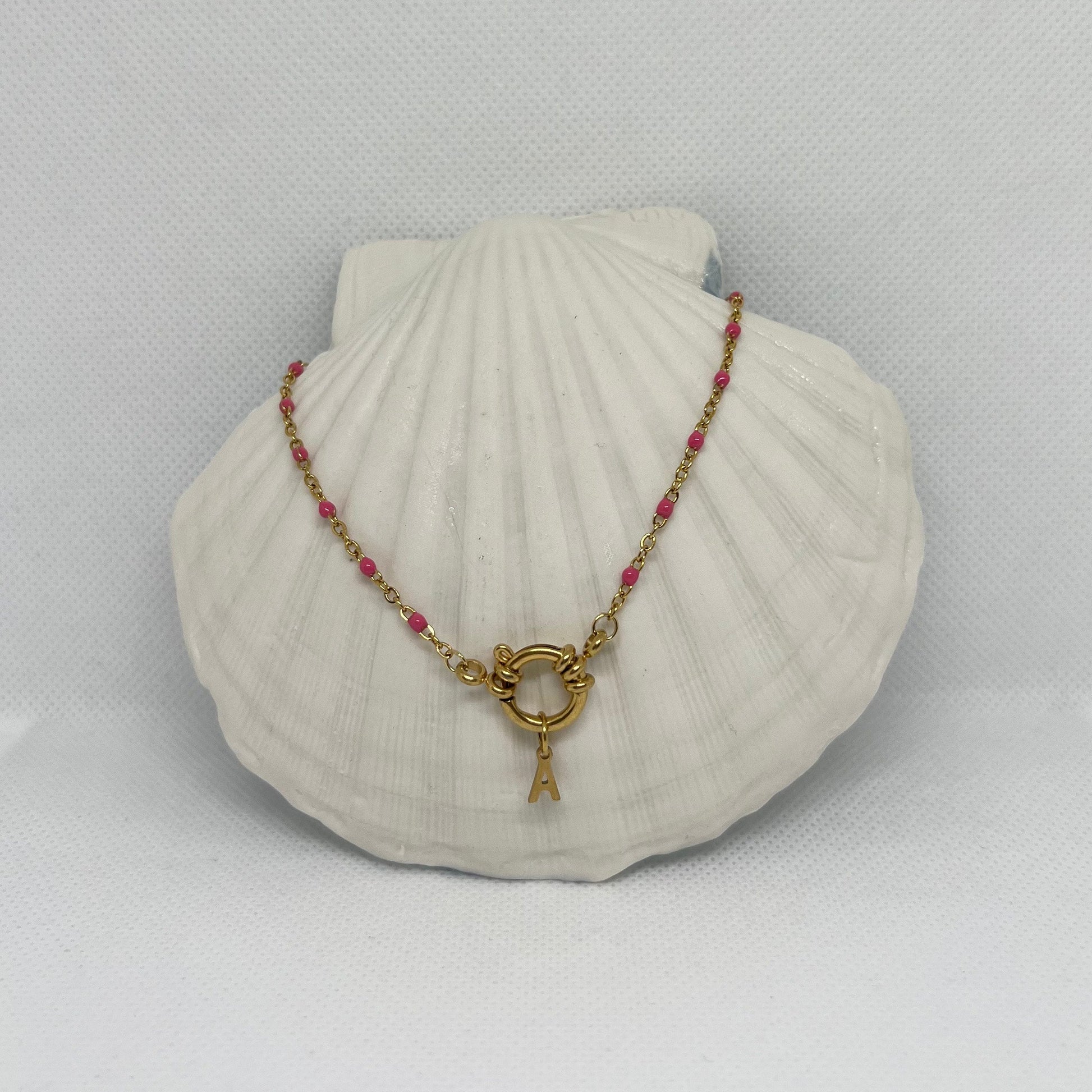 Collier "Agnès" perles & chaîne dorée pendentif initiale en acier inoxydable rose