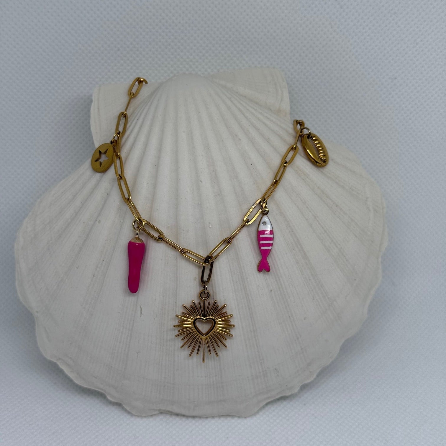 Collier "Rose" breloques charms, chaîne petite maille dorée en acier inoxydable